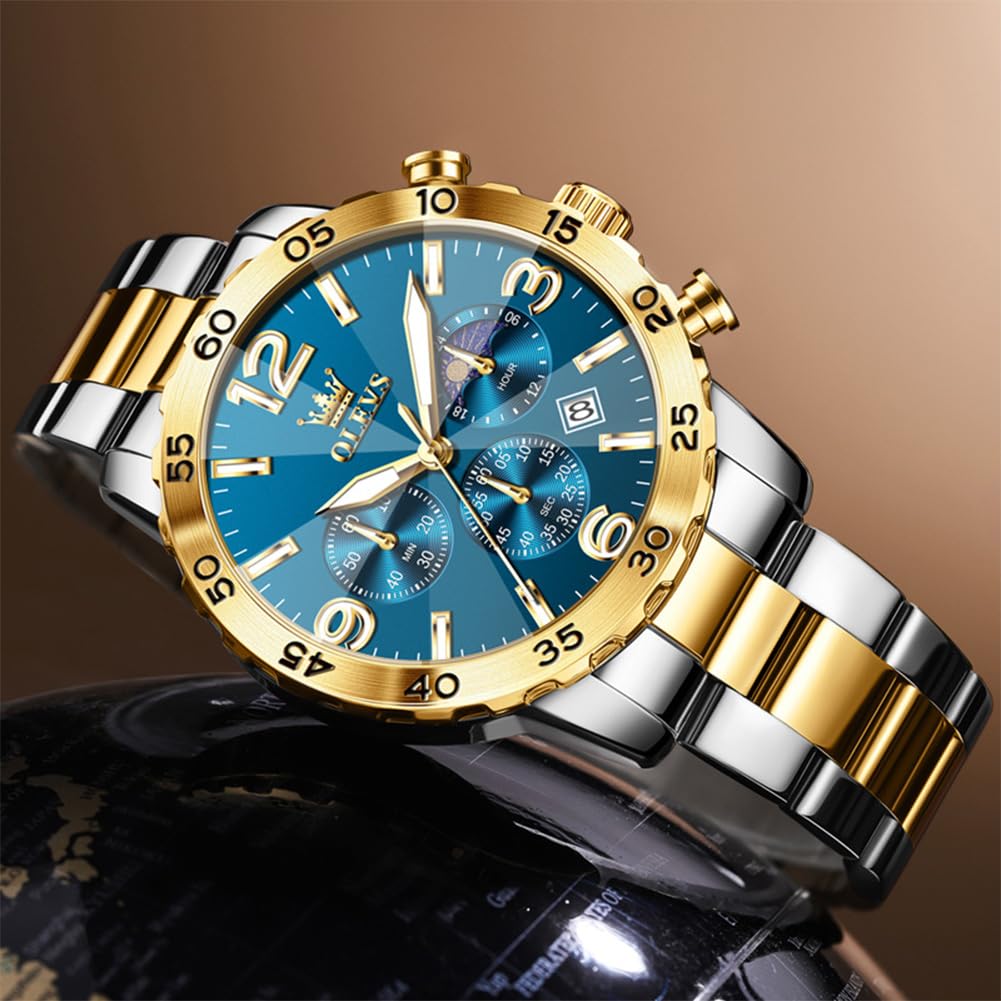 OLEVS Mens Watches Chronograph Big Numer Analog Quartz Original Watch Stainless Steel Date Waterproof Easy to Read Business Watch for Man