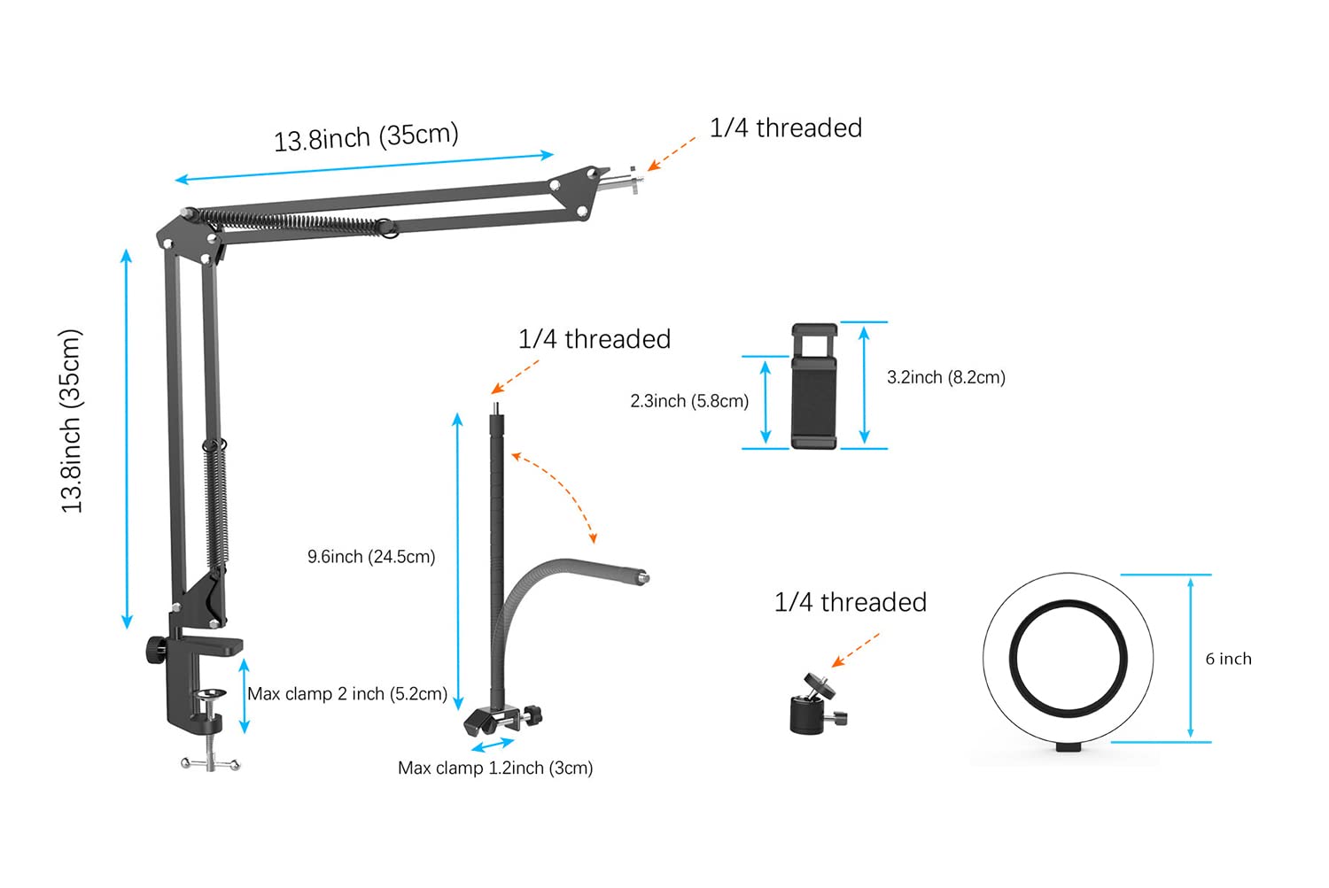 [ Shooting At Any Angle ] The head, arm ball joint and the base are flexible, you can adjust the swing arm angle and height as your wish to meet your different application scenarios like top down video recording, live streaming, baking; The Jaw Clamp fit the Desk, Table, Sideboard Max thickness 5.2cm (2 inches)