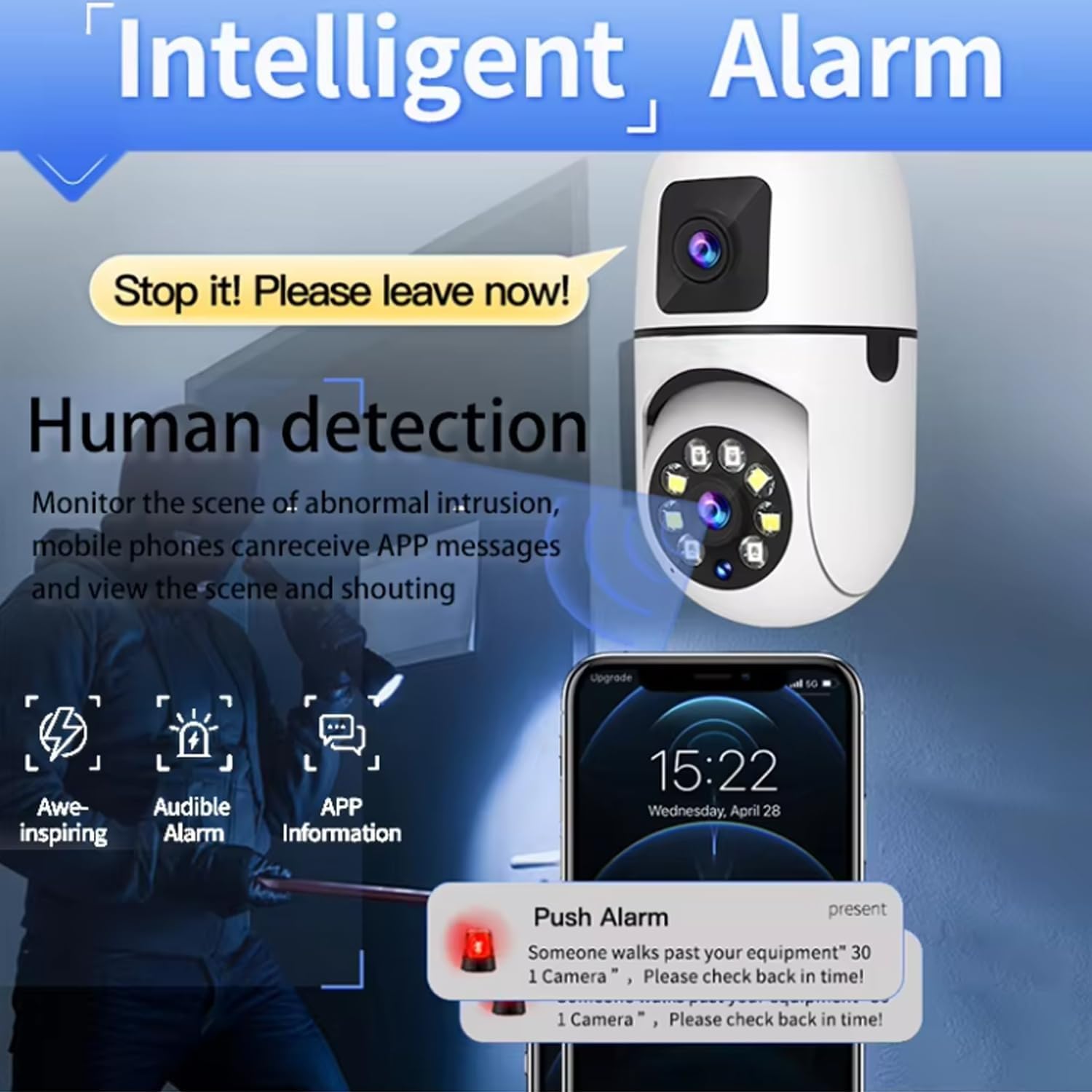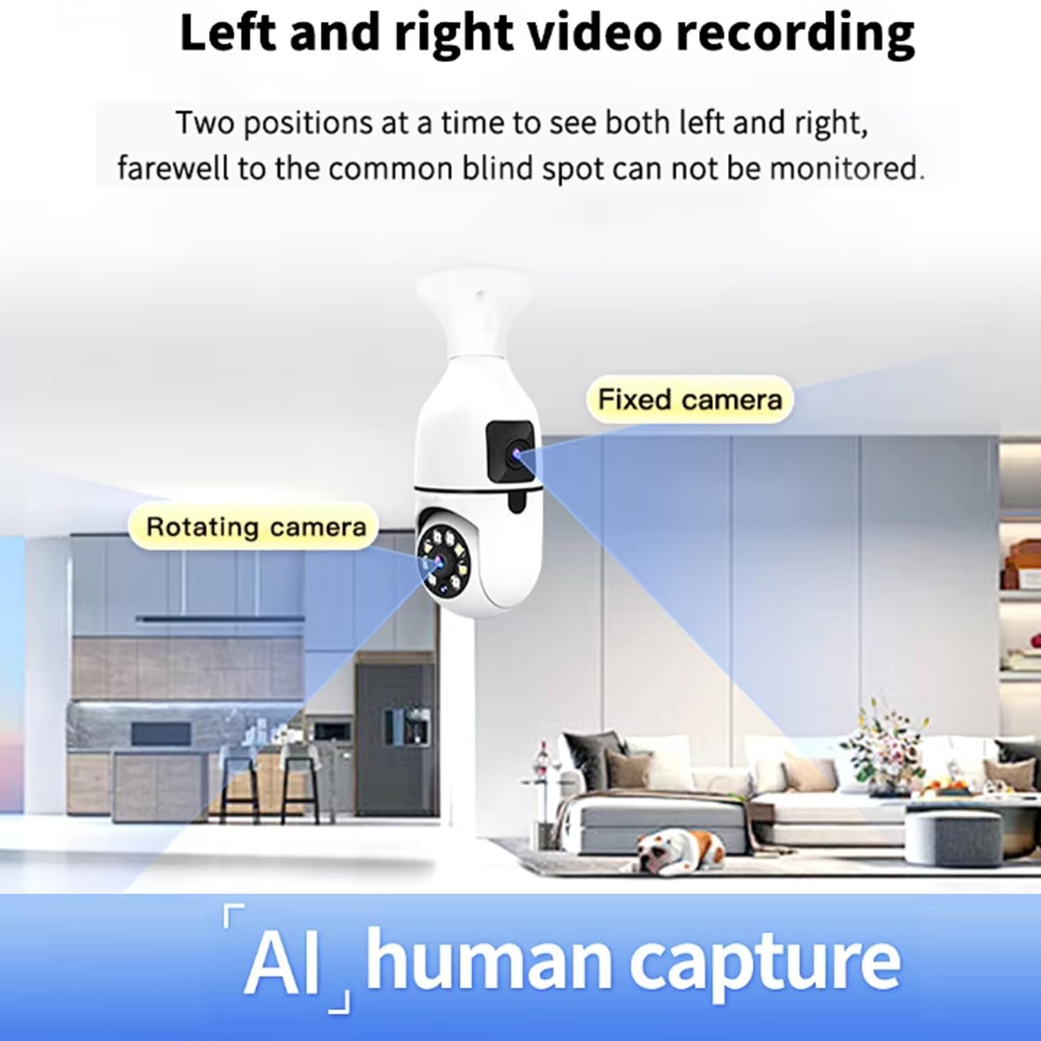 Dual Lens Technology: Equipped with both wide-angle and zoom lenses, this camera delivers comprehensive coverage and detailed views of your surroundings, ensuring no corner is left unmonitored.Seamless WiFi Integration: Connect effortlessly to your home network for real-time video streaming and remote access via a user-friendly smartphone app. Stay connected and in control from anywhere, at any time.Two-Way Audio Communication: Equipped with a built-in microphone and speaker, this camera allows for real-time communication, so you can listen and speak directly through the device.Motion Detection Alerts: Receive instant notifications when motion is detected, thanks to customizable sensitivity settings that help you stay alert to any unusual activity.Smart Lighting Functionality: Not only does this device function as a security camera, but it also serves as a light bulb with adjustable brightness and scheduling features to fit your needs.Easy Installation: Designed to fit into standard E27 light bulb sockets, the camera is easy to install and requires no additional wiring, making it a hassle-free addition to your home.Enhanced Privacy and Security: With encryption protocols in place, your video feeds and data are protected from unauthorized access, ensuring your privacy is safeguarded.