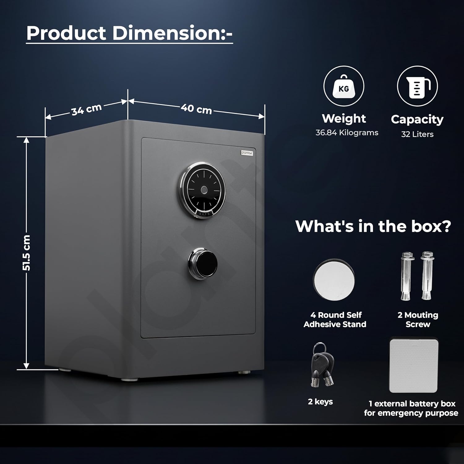 𝗠𝗮𝘁𝗲𝗿𝗶𝗮𝗹 : The Plantex burglary safe locker is made of high-strength iron with a scratch, fire, and water-resistant black powder coating. Its tamper-proof design secures your valuables, offering 32 litres of storage (50.5 x 40 x 34 cm). easy to install with pre-drilled holes and included screws, it comes with a 2-year warranty By plantex.