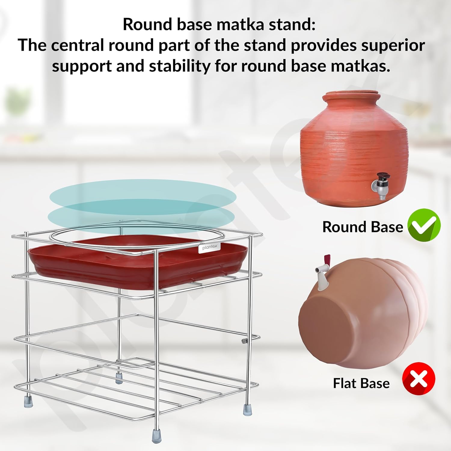 𝐃𝐮𝐫𝐚𝐛𝐥𝐞 𝐂𝐨𝐧𝐬𝐭𝐫𝐮𝐜𝐭𝐢𝐨𝐧: Plantex matka stand crafted from 5mm thick wire and stainless steel with a touch of nickel chrome mirror finish, with tray is ABS material, this stand is built for durability and longevity. It resists corrosion, distortion and reliably supports heavy water pots or water dispensers.