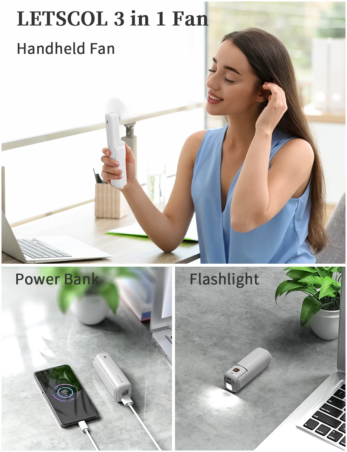 Portable Mini Fan, 3 in 1 Handheld Fan, Portable Travel Fan, Small Folding Pocket Fan, Personal Desk Fan with Power Bank, with Makeup Flashlight for Women (White)