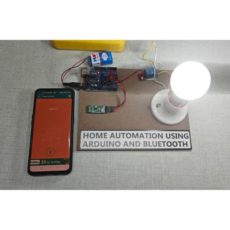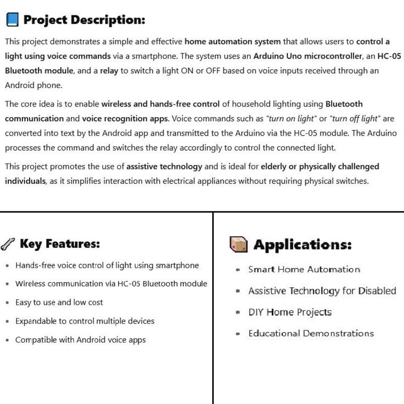This project demonstrates a simple and effective home automation system that allows users to control a light using voice commands via a smartphone. The system uses an HC-05 Bluetooth module, and a relay to switch a light ON or OFF based on voice inputs received through an Android phone.The core idea is to enable wireless and hands-free control of household lighting using Bluetooth communication and voice recognition apps. Voice commands such as “light on” or “light off” are converted into text by the Android app and transmitted to the HC-05 module. This project promotes the use of assistive technology and is ideal for elderly or physically challenged individuals, as it simplifies interaction with electrical appliances without requiring physical switches.