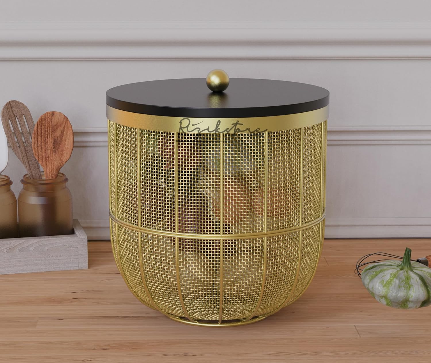 Overall Size: 8.8″ Diameter x 9.5″H. The height of the basket is 9 inch and the height of the lid 0.5 inch, perfect for fruits, vegetables or other foods.Material: Durble iron wire mesh, not easy to tear, fade or crack for long-lasting use.Package Includes: 1 pc fruit basket with 1 pc lids in Gold color.