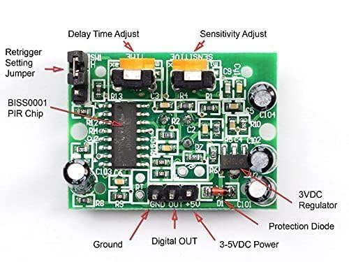 – Current drain: <60uA – Output signal: HIGH/LOW (3.3V TTL level) – Detection distance: 3m to 7m (adjustable) – Detection angle: <140° – Delay time: 5s to 200s (adjustable; default ~5s ± 3%) – Block time: 2.5s (default) – Operating temperature: -20°C to +80°C – Dimensions: 3.2cm × 2.4cm × 1.8cm (approx.) – Sensitivity adjustment: Rotate clockwise to increase range (up to ~7m), counter-clockwise to reduce (down to ~3m) – Time adjustment: Rotate clockwise to increase delay (up to ~200s), counter-clockwise to reduce (down to ~5s) Applications