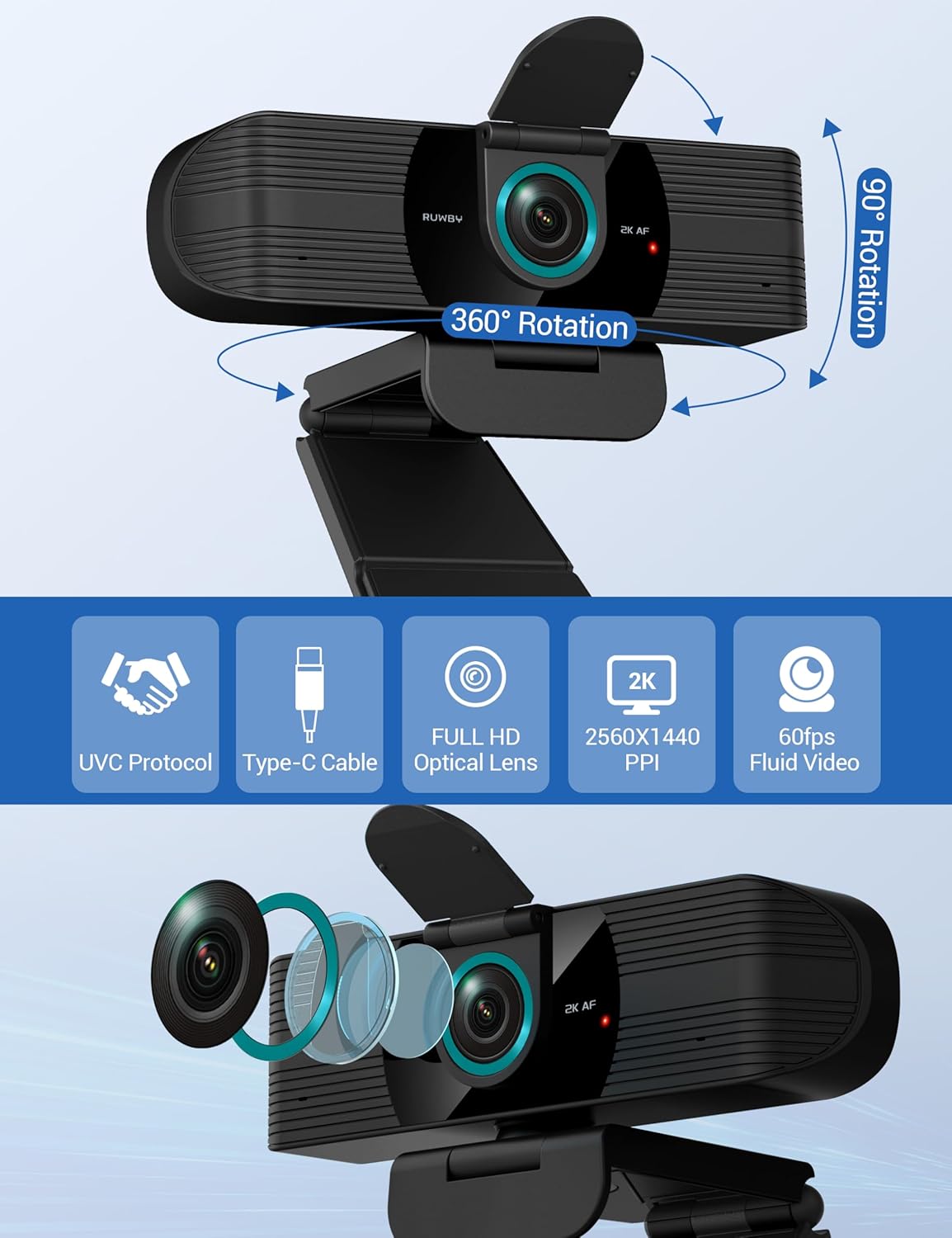 QHD Video and Wide View Angle – The Ruwby High Definition 2K Webcam features a wide angle lens and delivers crisp clear images and fluid video at 60 frames per second while gaming, video calling, online teaching, live streaming, or recording.