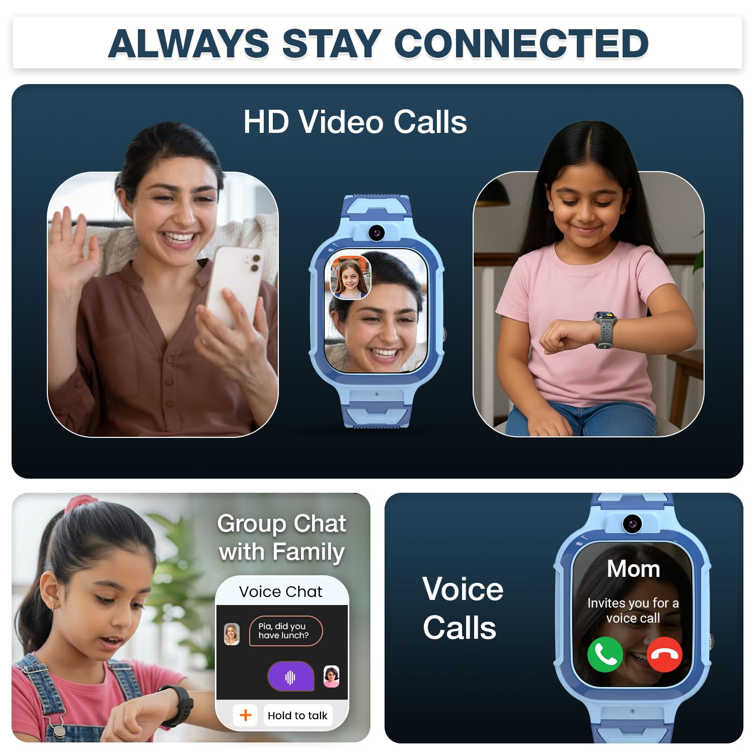 ✅ [Always Stay Connected] – Kids can make HD video calls, phone calls, and voice chats directly from this calling watch for kids. Only paired parent-approved numbers can connect, ensuring safe communication.