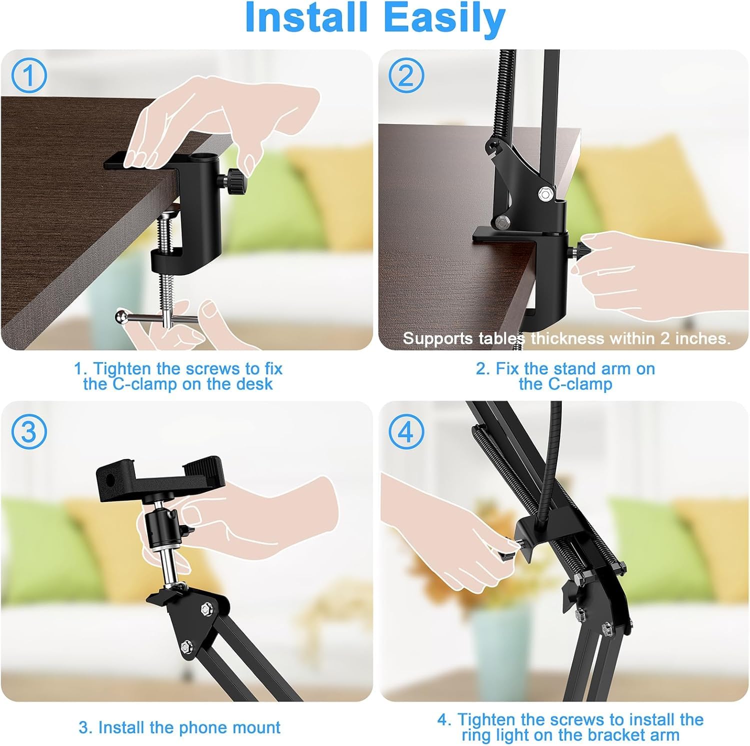 Easy to Install & Disassemble:Overhead phone mount for recording is multifunctional but simple in structure. No tools needed, it can be widely settled to bed board, cabinet, table, bookcase, or any surface up to 2 inches thickness. It is light in weight and easy to carry, you can easily fold it up to transport or store with ease.