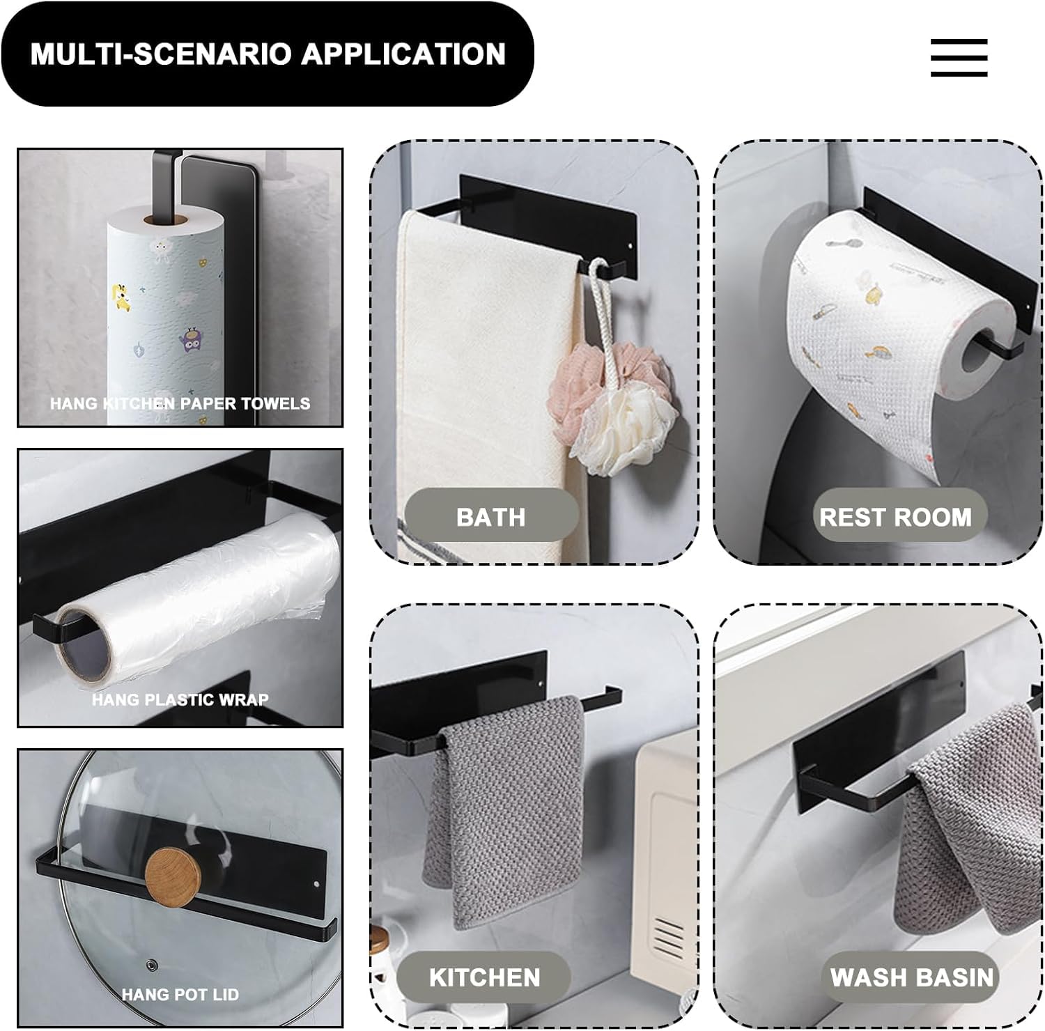 No Drilling: Made of high quality Metal, strong and durable, with a long service life, this kitchen roll holder has good bearing capacity and stickiness and does not fall off easily, it is the ideal choice for your storage needs. Great for hanging small kitchen gadgets like paper roll, towels, brush, kitchen utensils, spatulas, etc.