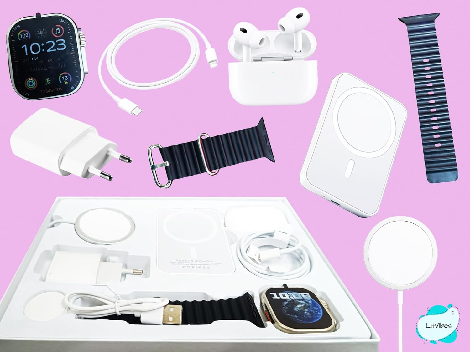 Litvibes Smartwatch is enabled with Bluetooth Calling Function,can receive & make calls directly from your watch.The Watch has a 49 mm display which has smooth drag screen effect.The Smartwatch comes with a sleek & durable metal body. The build quality of the watch has been made for high durability keeping in mind for the day to day usage.The set contains smart wireless earphones which will help you attend calls & listen to your favourite music without any hassle.Both the smart watch & wireless earphones can be paired with bluetooth & are compatible with all the android & iOS devices & phones.The Wireless powerbank helps you charge your charge your devices wireless which make it a portable pocket friendly option for your travel.The Set contains 1* Smartwatch,1* Wireless Earphones,1* Wireless Powerbank,1* Watch Big Charging Cable,1* Lightning Cable,1* Fast Adaper,1* Small Watch Charging Cable,User Manual.