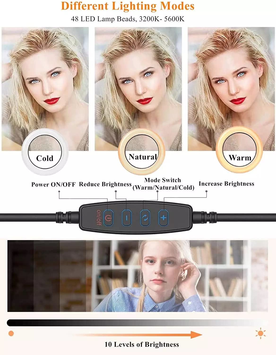 Dimmable Ring Light: 3 colors lighting mode: Soft White, Natural Light, Warm Light ( 2600-6000K ) CRI:90-95. Each lighting mode has 10 adjustable brightness. Allowing you to have a light environment that suits any makeup /photography/live broadcasting/YouTube/Tik Tok video recordings