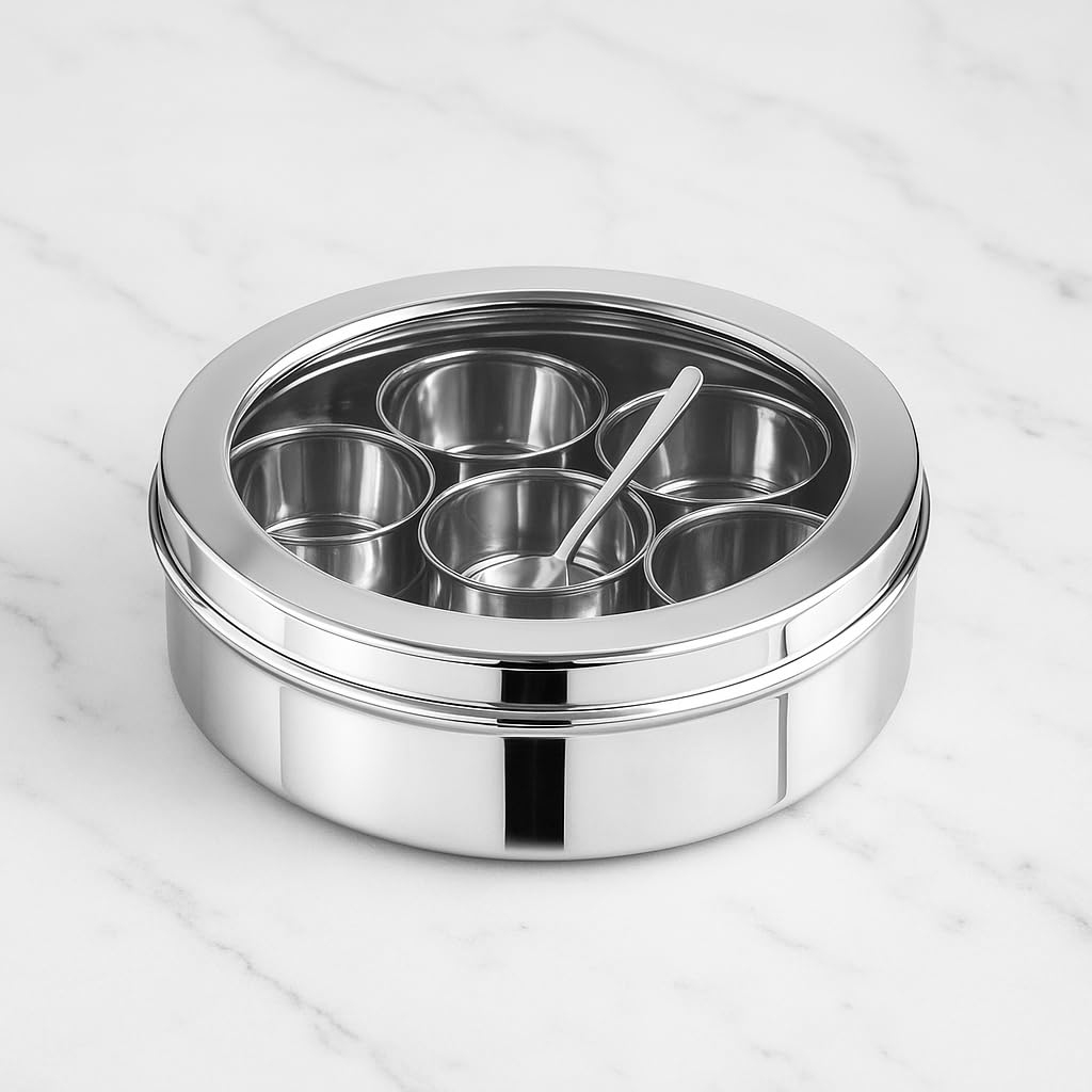 Keep your kitchen neat, organized, and stylish with the Aquasleri Stainless Steel Masala Box – 7-in-1 Round Spice Container. Designed for everyday use, this premium-quality 1.5L masala dabba (Size 11, 18.5 cm diameter) helps you store and access your essential spices easily while enhancing your kitchen décor. This spice box is made from food-grade stainless steel that is durable, rust-resistant, and safe for long-term spice storage. Inside the container are 7 removable compartments, ideal for keeping your regular Indian spices such as turmeric, red chilli powder, cumin, garam masala, and more—all in one place. It features a transparent see-through lid made from high-quality acrylic, allowing you to view the contents without opening the box. The snug-fitting lid ensures spices stay fresh, dry, and protected from moisture, air, and dust. A dedicated stainless steel spoon is also included for quick and hygienic spice handling. Compact yet spacious, this masala container has a 1.5L capacity and 18.5 cm diameter, making it perfect for daily kitchen use while saving countertop space. Whether you’re a home cook or a beginner, this spice box is the perfect solution to keep your masalas easily accessible and neatly organized.