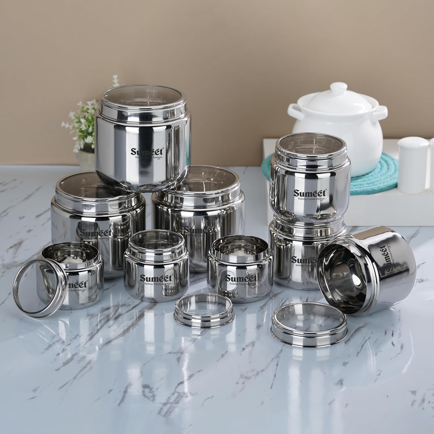 Sumeet Stainless Steel Canisters/Dabba/Storage Containers for Kitchen with See Through Lid, Combo of 9 Pcs (400ml -3Pcs + 9cm, 800ml – 3Pc + 11cm & 1450ml – 3Pc with 13.5cm Dia), Silver