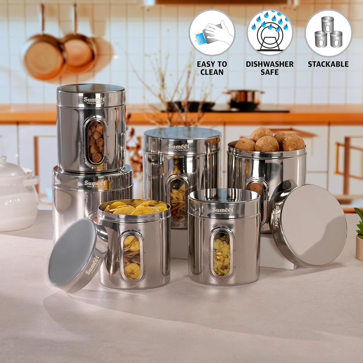 Sumeet Brand Keeps your kitchen organized in style with our Premium Stainless Steel Vertical Canister, designed for both elegance and practicality. Featuring a sleek mirror finish and a transparent see-through window, this container allows you to easily view contents at a glance—perfect for storing tea, coffee, sugar, pulses, snacks, and more. The innovative Push-Pull lid mechanism ensures an airtight seal to preserve freshness, while the vertical design saves space and adds a modern touch to your countertop. Made from high-quality, food-grade stainless steel, these canisters are stackable and nestable, making storage simple and efficient. Key Features: ✅ Push-Pull Lid – Easy access with a secure, airtight closure ✅ Transparent Window – Instantly check contents without opening ✅ Premium Stainless Steel – Rust-proof, durable, and food-safe ✅ Mirror Finish – Sleek, modern, and elegant appearance ✅ Available in Various Sizes – Ideal for all your pantry needs ✅ Stackable & Nestable – Saves space in cabinets and counters ✅ Easy to Clean – Dishwasher safe and low-maintenance. Whether you’re organizing your kitchen or upgrading your storage, these vertical stainless-steel canisters combine functionality, durability, and style—a must-have for every modern kitchen. Pack Contains:6 Containers: No.11-3 Containers- 11.5×11.5×13.3(cm), Capacity-1100ml, Weight-300gms(each); No.13-3 Containers- 13.3×13.3×15.5(cm), Capacity-1820ml, Weight-420gms(each)