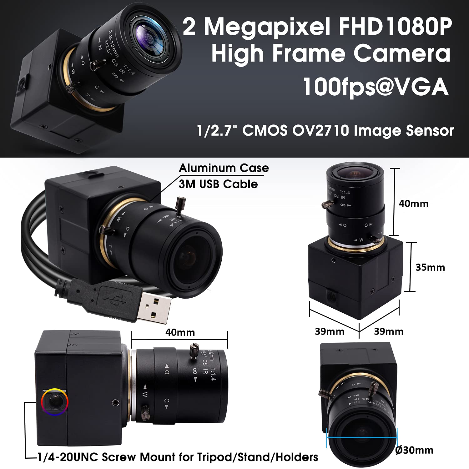 【Easy Install Video Camera】: Mini USB camera with aluminum case has standard 1/4 inches screw hole at top and bottom for tripod mount or webcam clamps/holders. Standard USB port with 3 meters USB cable easier for multiple applications for PC computer, laptop, desktop, desk and studio shooting, and high level video system for industrial