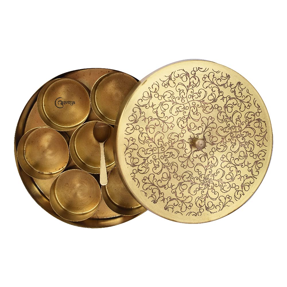 The Advitya Brass Masala Box For Kitchen|Spices Storage Containers|Handmade Golden Masala Container/Spice Box With Embossed Lid 7 Compartments And 1 Spoon (8 Inch, Large)