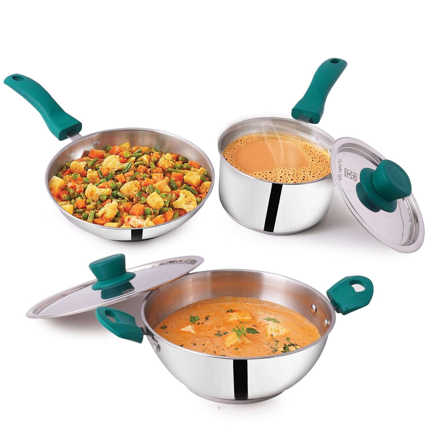 😌EASY TO USE DESIGN: The kadai, fry pan and saucepan have beautiful, cool-touch green bakelite handles that give you a comfortable grip. The stainless steel kadai and saucepan comes with a stainless steel lid that has a green heat-resistant knob. The air vent holes on the lid are for releasing steam and extra moisture – giving you excellent cooking results.