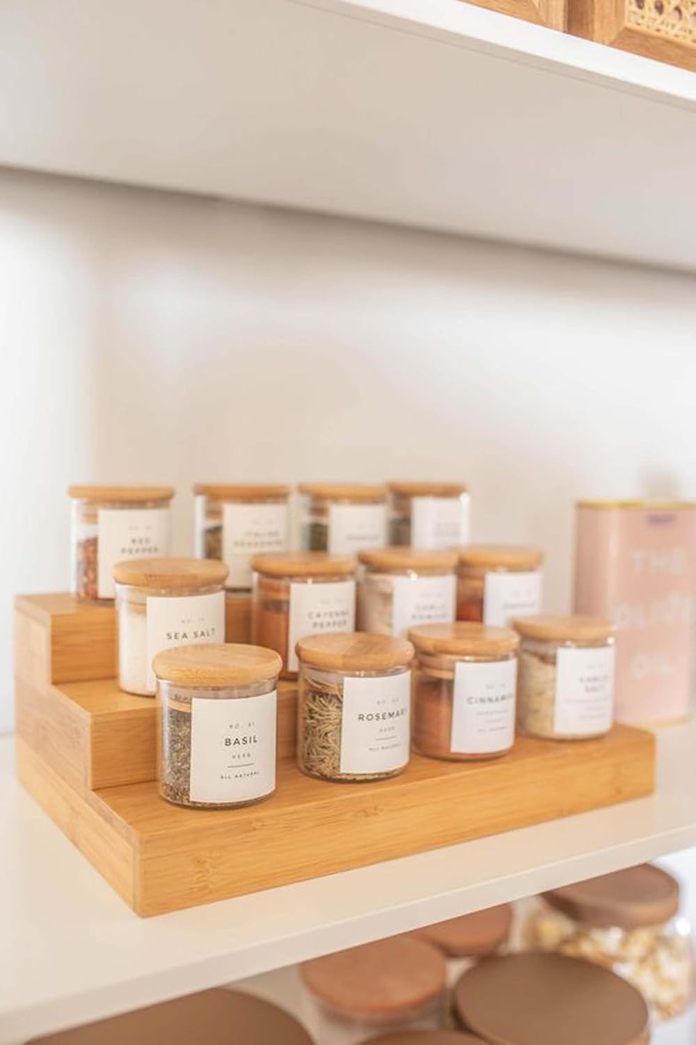 This 3 step spice rack is made of quality wood material. Organize & display spices, spice jars, shakers, snacks, grinders, dry goods, condiments, vitamin bottles, medicine bottles, jar and more.