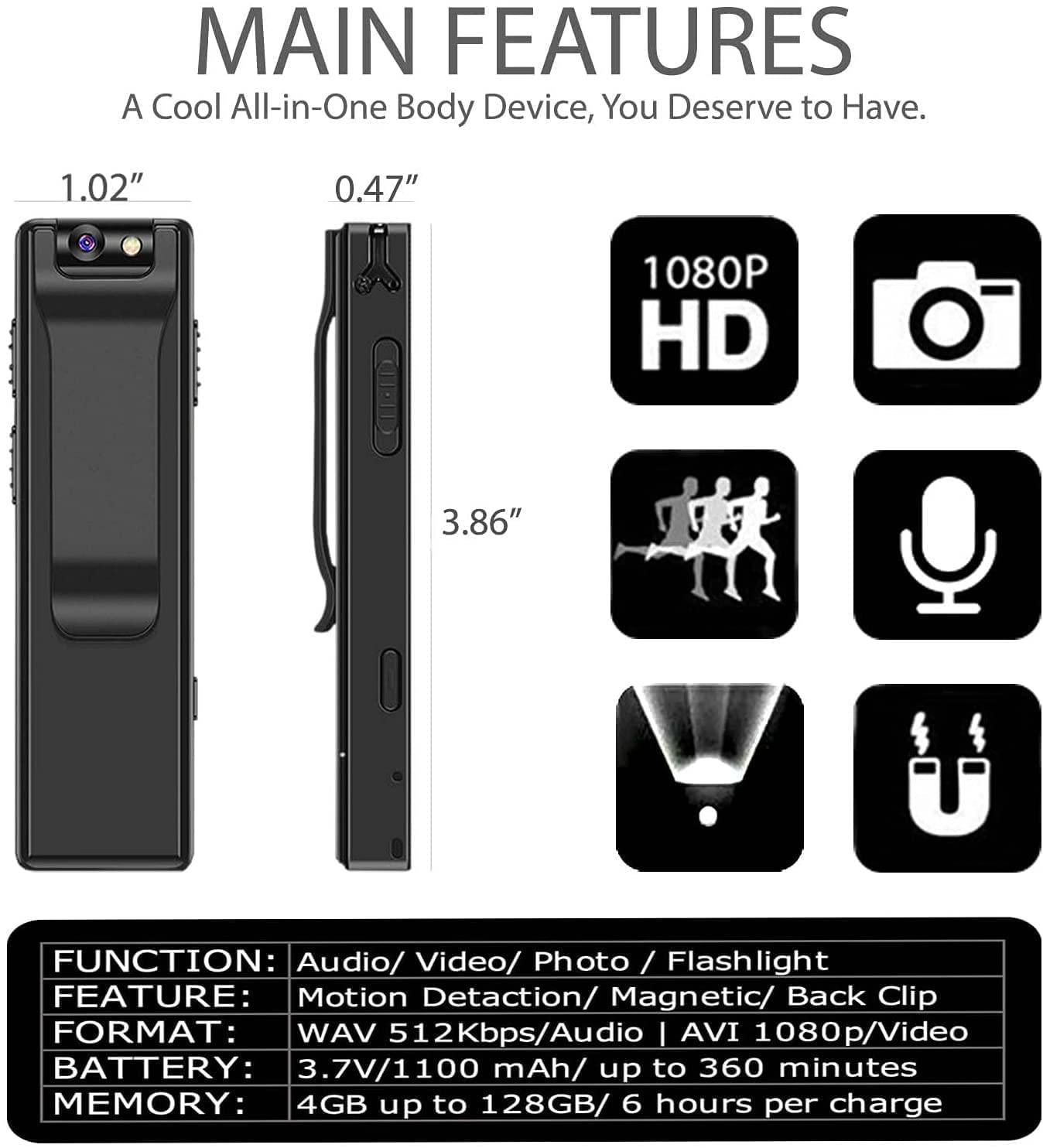 [Long time working]: This body camera provide 4-5 hours of video recording after single charger.