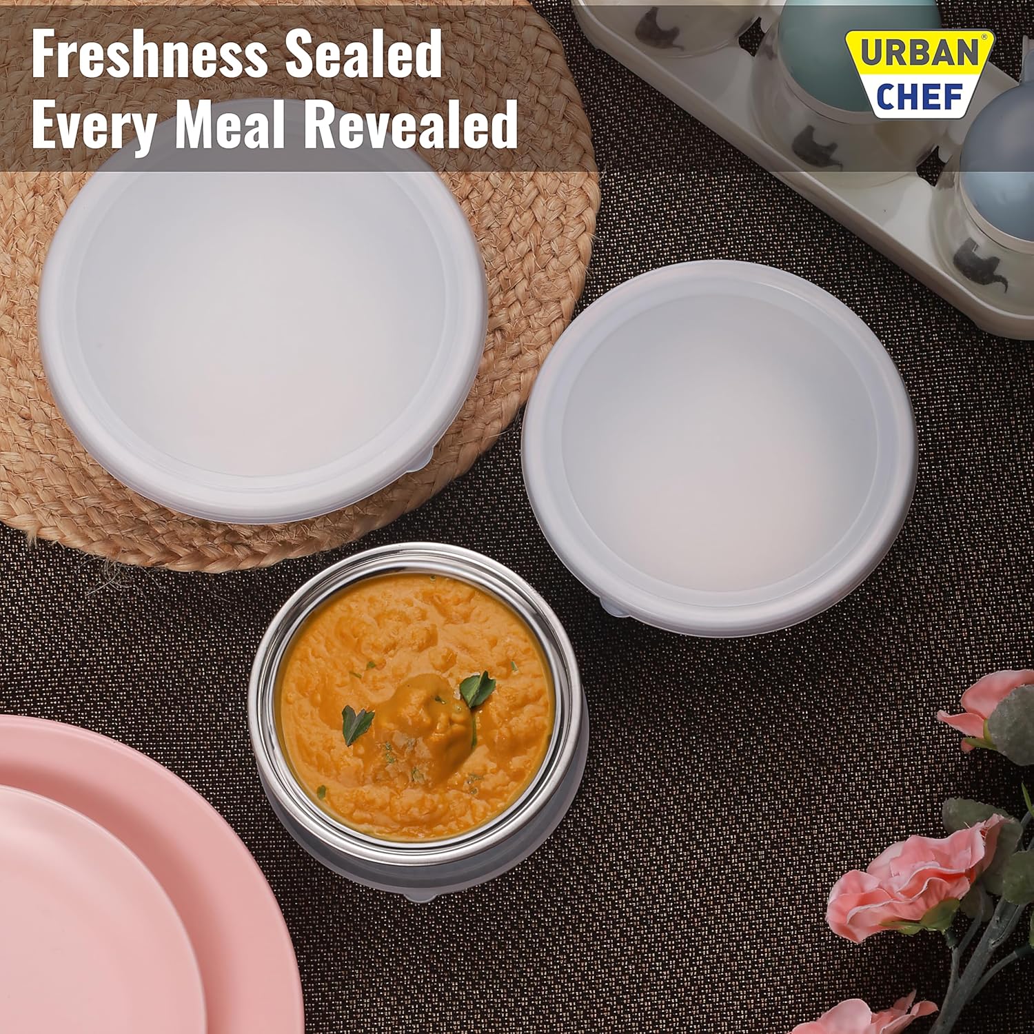 100% Food Grade Stainless Steel for Inside and Plastic Coating of Polypropylene at the Outside. They have a wide mouth with rolled rim for sturdy grip and their flat base ensures countertop stability. The Plastic Lids are Airtight, Leakproof retaining the freshness of stored food for long hours.