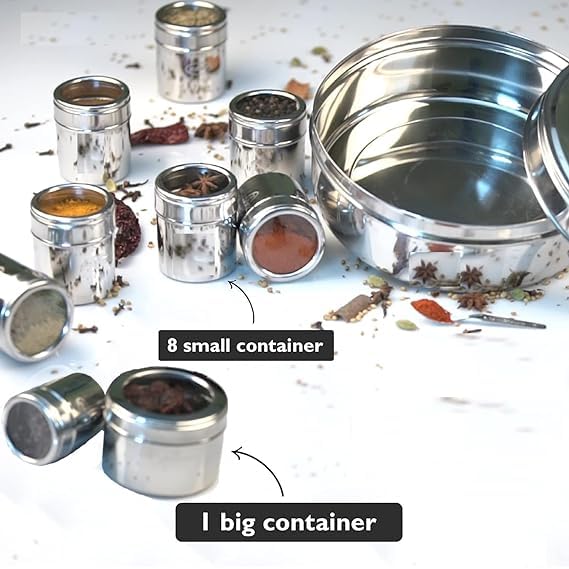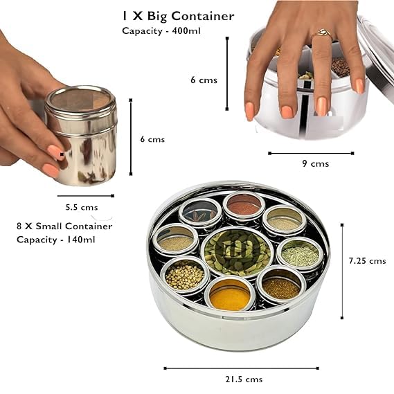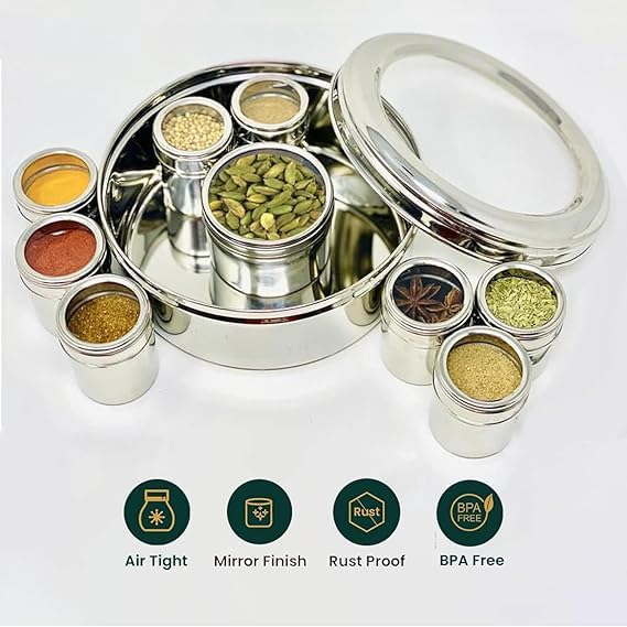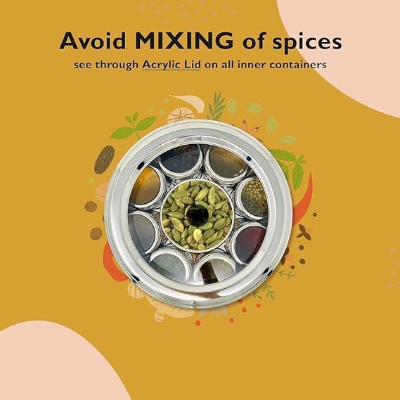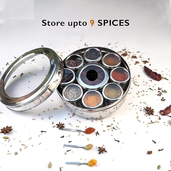 VOMI in 1 Spice Box Stainless Steel stylish Extra Large | Masala Box for Kitchen Steel | Masala Dabba Steel | Masala Dani for Kitchen It is having transparent visibility so that you can easily identify the different types of Masalas. It just not added value to your kitchen but will add value to your food as well. You can add traditional flavor with the help of a modern and updated kitchen version with us. Masala Dani and inner containers have to air-tight acrylic lids to avoid any accidental cracks and mix-up of contents. Preserves freshness and prevents contamination of spices. Do not get loose/tight with usage. Herbs and spices are the essential ingredients that add flavor, life, and personality to every dish you cook. In order to make the most of your spices, they must be fresh. Spices don’t necessarily “go bad”, but they do lose freshness over time. Air, heat, and moisture are the factors that affect the freshness of spices. Keeping moisture out of your spices is particularly important. 9 in 1 Spice Box Stainless Steel stylish Extra Large | Masala Box for Kitchen Steel | Masala Dabba Steel | Masala Dani for Kitchen High-Quality It is always like by the queens of the kitchen because it facilitates them with the availability of nine in one and makes their tasks complete. You can add different flavors of masala in one masala box under the available space. it will give ease to your task. Multipurpose Use The stylish masala organizer for the kitchen has 9 inner Containers with 1 Spoons. The Airtight Acrylic lid makes visibility easy. The steel boxes for the kitchen are commonly used to keep spices such as cumin seeds, cardamom, garam masala, turmeric powder, red chilies, coriander powder, and much more. It can be used to store & serve (without inner containers) roti, cookie, papad, khakra, chocolates, cakes, bread Dimensions The Measurement of the Steel masala box : 8.5 cms Height, 22.5 cms Diameter; Small inner containers: Diameter – 6cm, Height – 7cms, Capacity