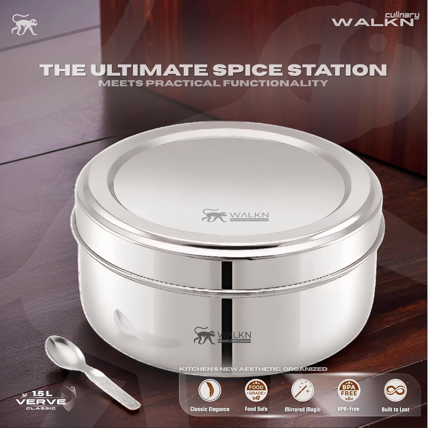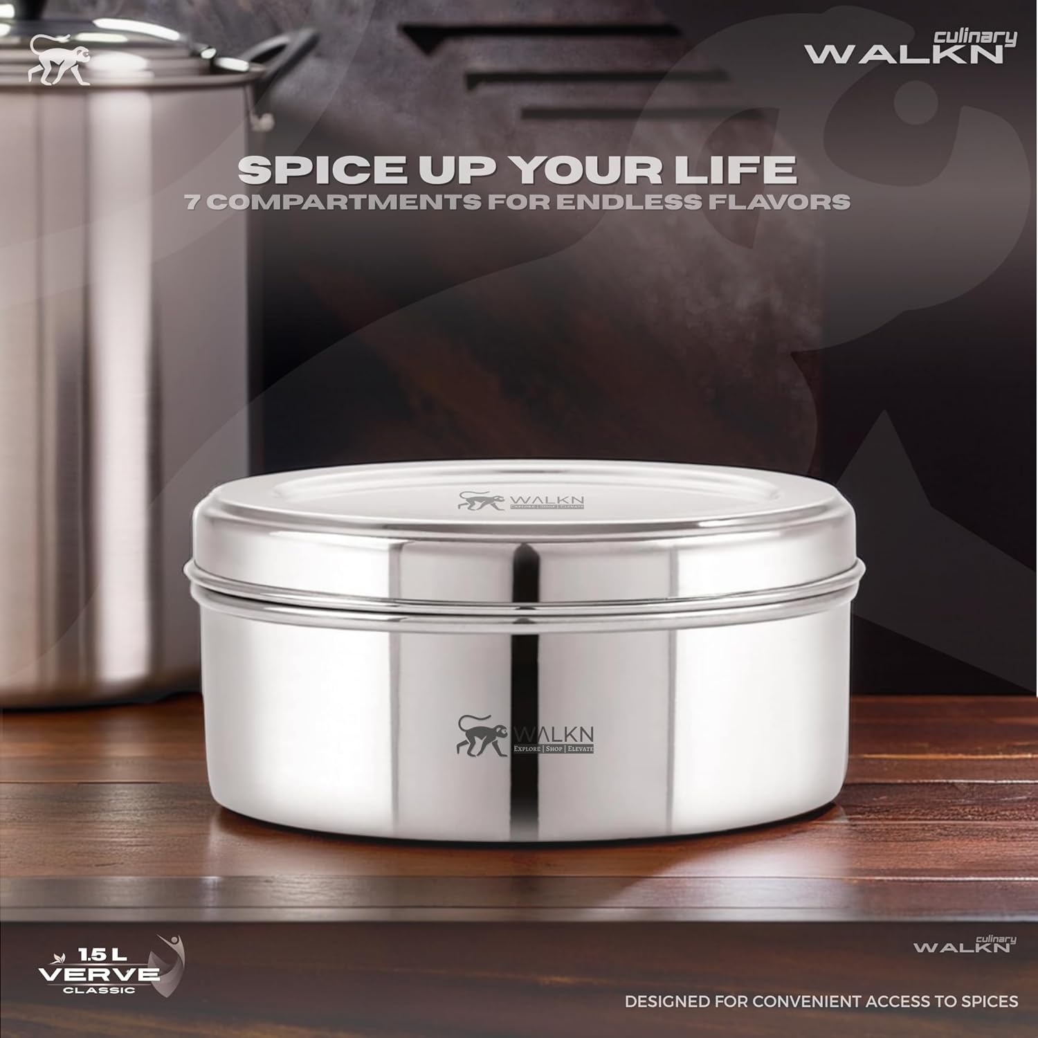 Organize Your Flavors, Elevate Your Cooking! Say goodbye to messy spice jars and lost flavors! The WALKN Verve 1.5L Stainless Steel Masala Box is designed to keep your kitchen organized, hygienic, and efficient. Whether you’re preparing a rich curry or a quick tadka, this airtight spice dabba ensures every spice stays fresh, dry, and ready to use. Crafted from high-quality, food-grade stainless steel, this masala daani resists rust, stains, and corrosion — built to last through years of daily use. The 1.5L capacity and 7 removable containers allow you to store all your favorite spices separately, eliminating cross-contamination and spillage. With a sleek silver finish, modern design, and compact 19 cm diameter, this spice organizer blends seamlessly into any kitchen setup. The included small spoon makes measuring spices effortless, while the secure lid locks in freshness and keeps pests out. Whether you’re a home cook, a busy parent, or a host who loves to entertain, the WALKN Verve Masala Box is your ultimate kitchen companion. It’s not just a container — it’s a smart, stylish way to organize your flavors and simplify your cooking experience. Perfect for: ✅ Indian households ✅ Gift-giving (weddings, Diwali, housewarmings) ✅ Cooking enthusiasts ✅ Anyone who values cleanliness and organization