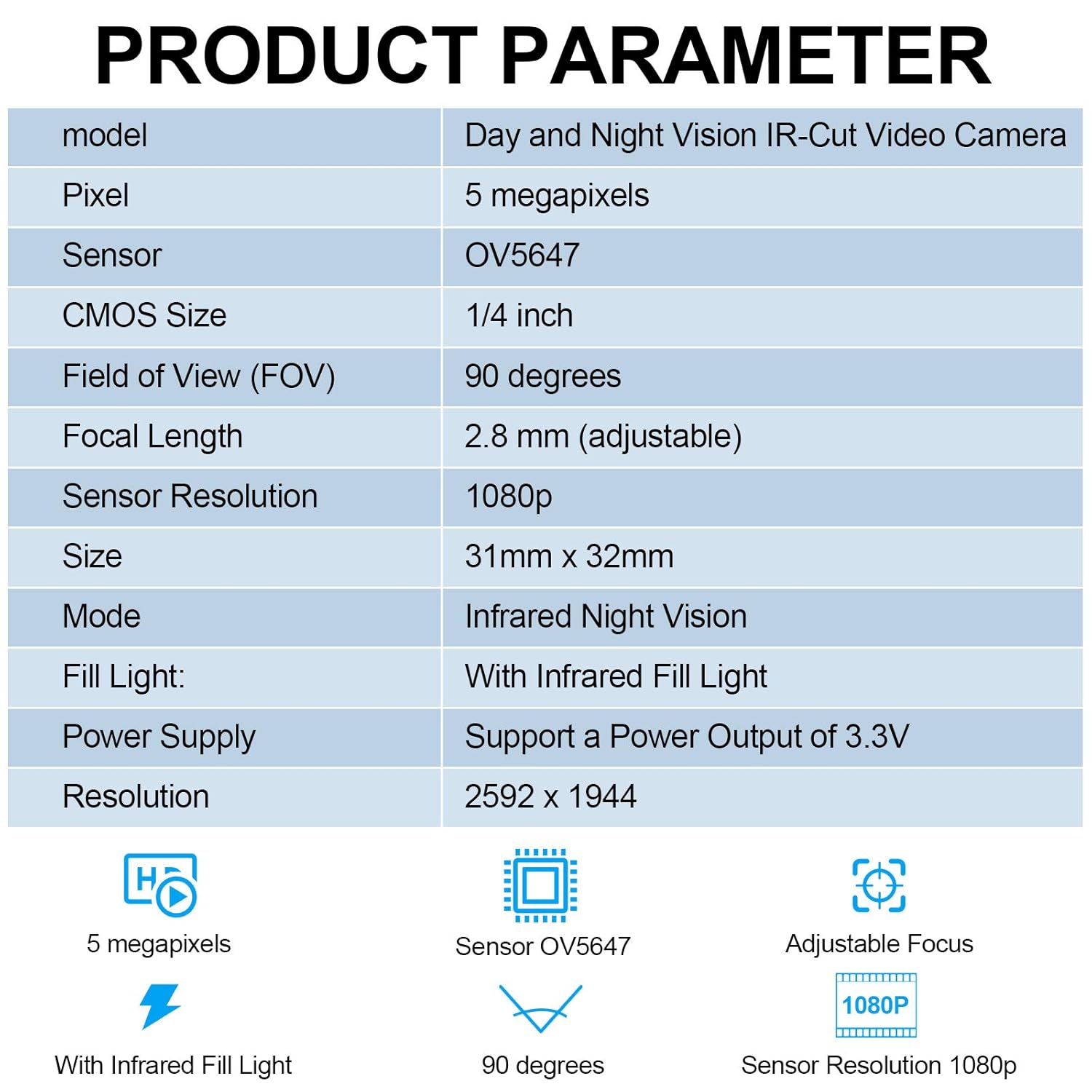 Nice performance: the IR-Cut video camera not only supports shooting 2592 x 1944 pixel static image but also supports recording 1080p@30fps, 720p@60fps and 640 x 480p 60/90 video; Featuring with 1080P 5MP OV5647 webcam sensor, 5 megapixels and adjustable focal length