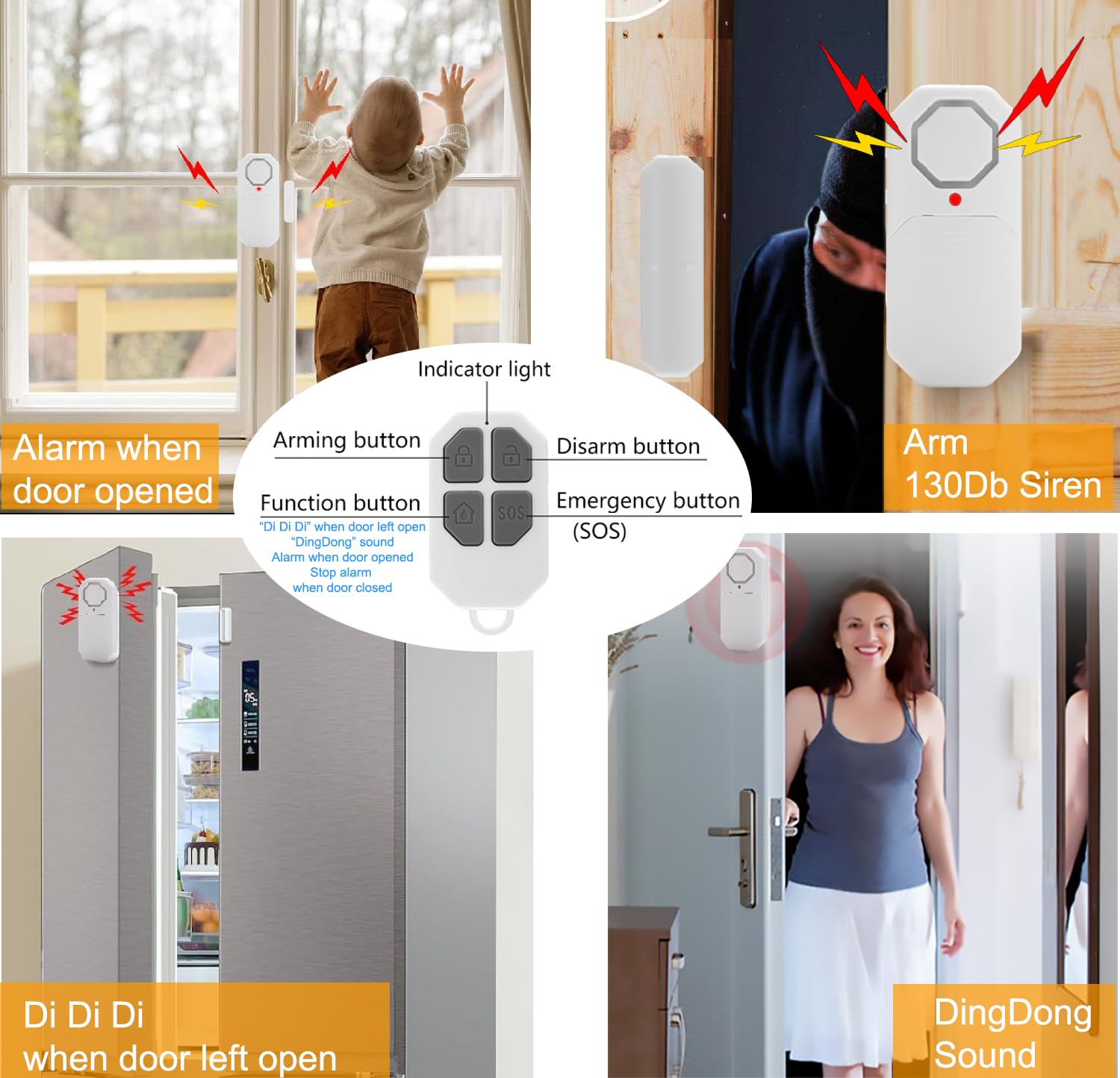 Door alarm has feature modes, use the remote to set it. 1. General Alarm (alarm stop if door closed); 2. Constant Alarm (constant alarm even door closed); 3. SOS Mode (press SOS button on remote keyfob the alarm sensor alarming); 4. Remind Mode (sound “Di..Di” to remind you door opens); 5. Door Open Chime (sounds “DingDong” once if door opens)