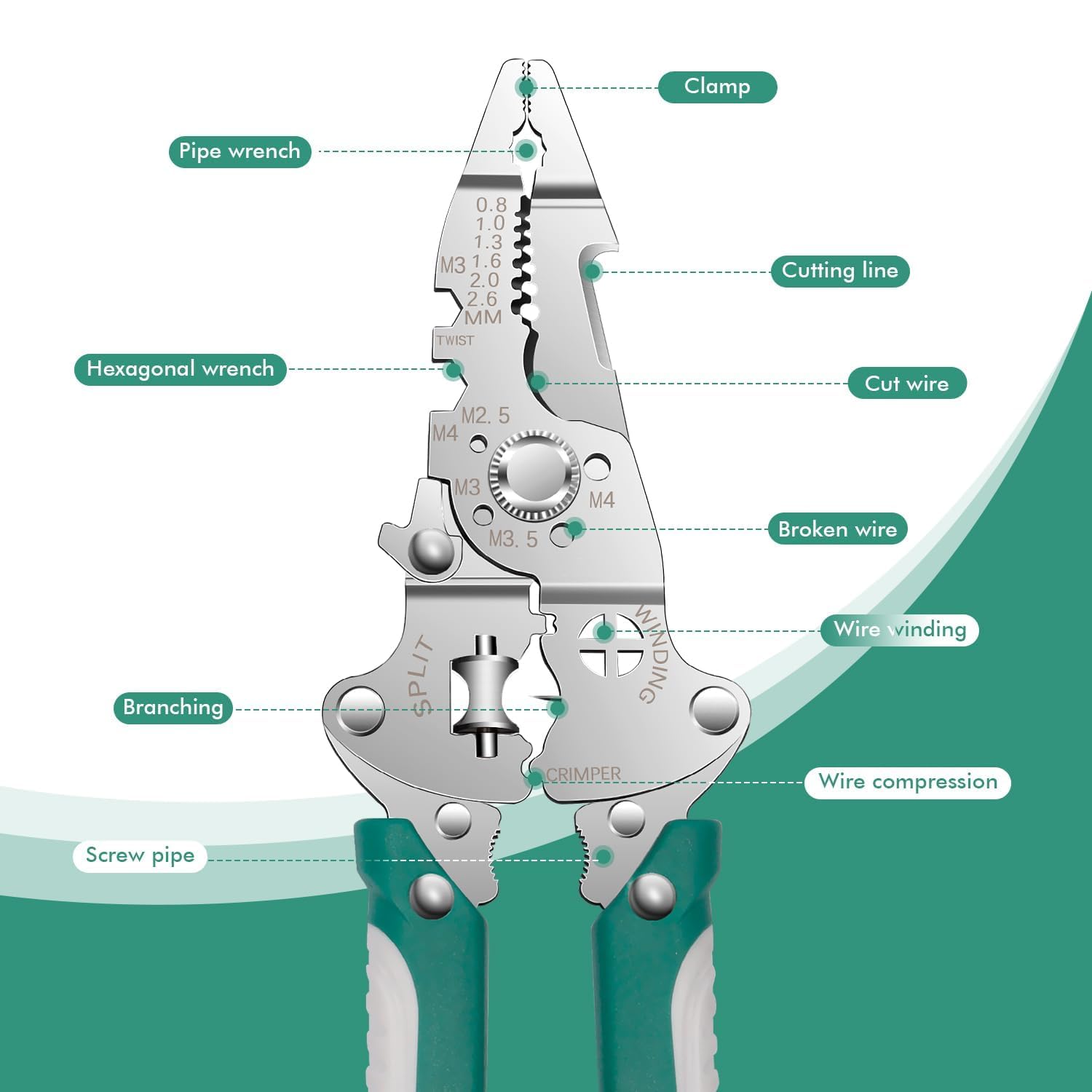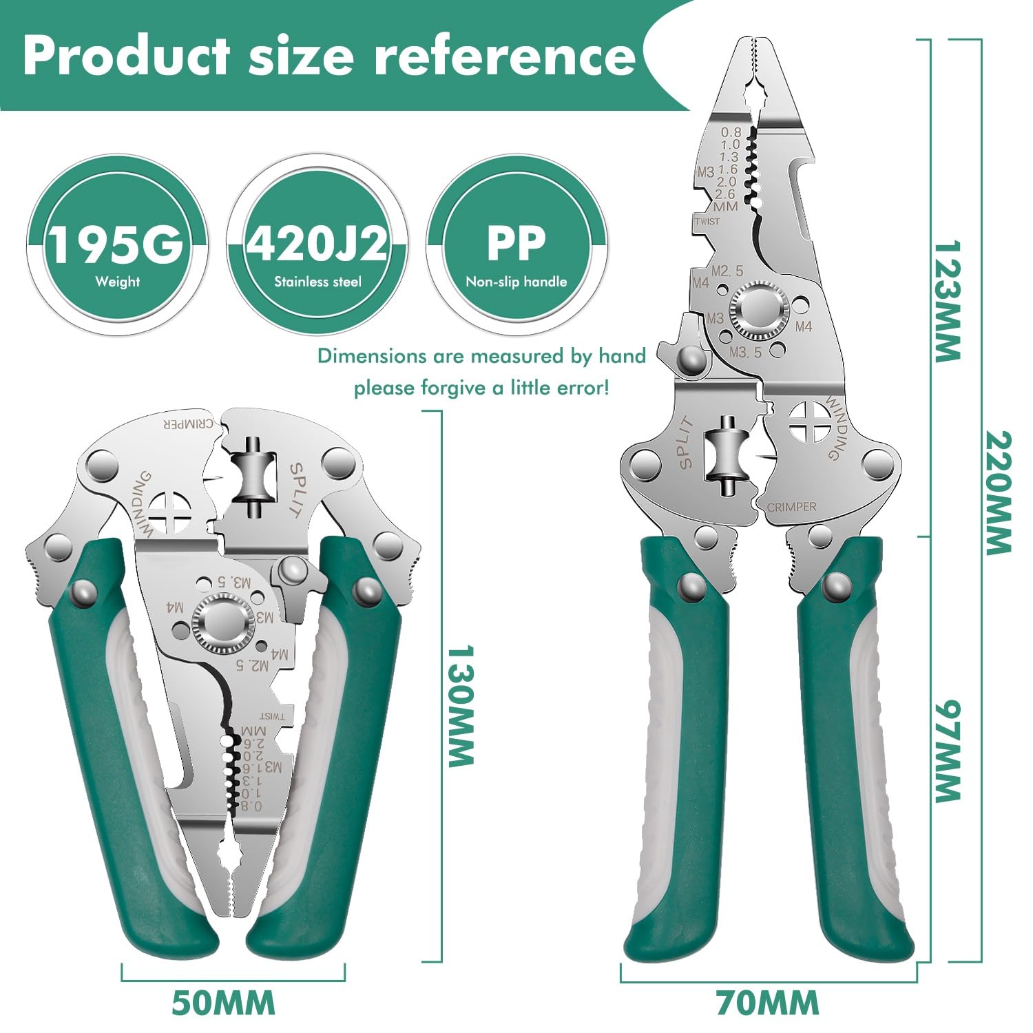 All-in-One Tool: Combines wire stripping, cutting, crimping, splitting, and winding into one compact, efficient hand tool.