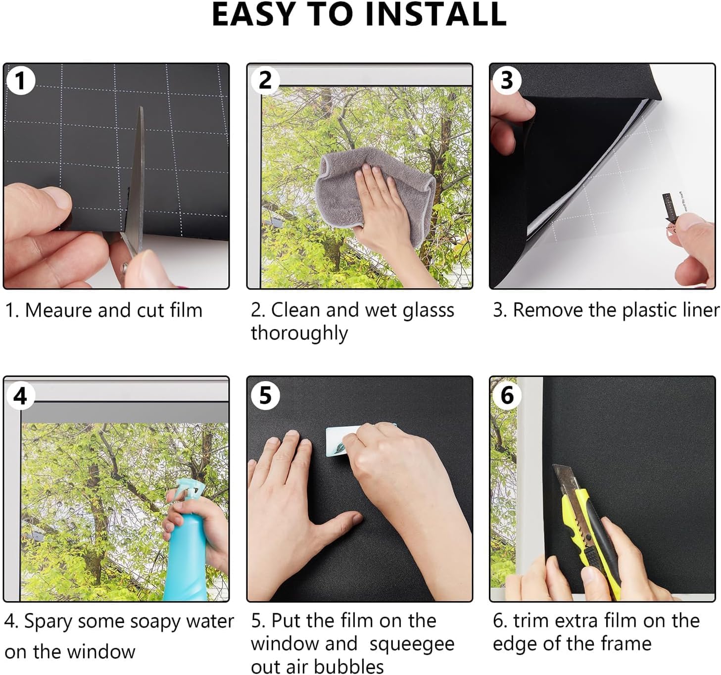 There is a label at the beginning of the film roll, which makes it easier to separate with the help of tape. After you tear off the backing film, you can make the tape into a pair of new labels.Please spray a large amount of soapy water on the glass and film, as the adsorption force will be stronger. After pasting, clean the area around the window with a cloth to avoid leaving any traces of soapy water.