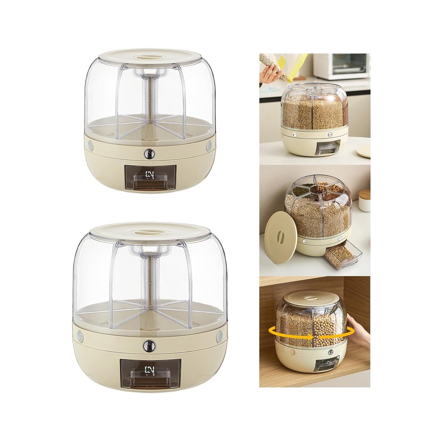 Storage: This grain storage organization features rotable storage, one button operation, compartment design, transparent and visible, classified storage.PP Material: This rice dispenser tank is made of premium PP material that is safe and healthy, and it is also durable and has long service life.Removable Cover: The PP grain storage container’s top cover is removable for easy grain addition which is convenient and practical.Function: Keep your food dry and safe with these plastic food storage containers. Helps maximize your space and keep items organized and easy to find.Space Saving: This grain storage organization is stackable and you can place it in the corner, which is practical and space saving.