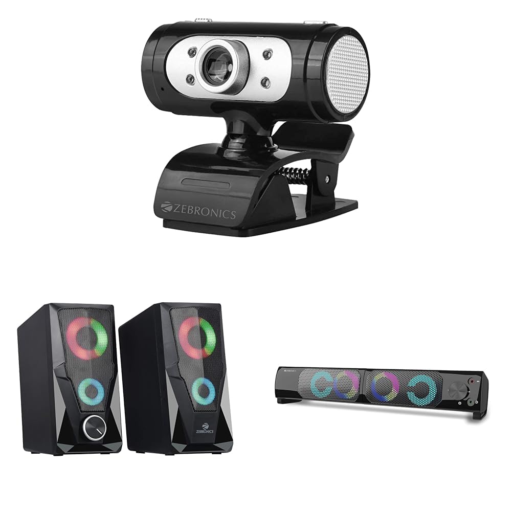 Zebronics Zeb-Ultimate Pro (Full HD) 1080p/30fps Webcam with 5P Lens, built-in Mic(Black) & Zeb-Warrior 2.0 Multimedia Speaker With Aux Connectivity & Zeb Wonderbar 10 USB Powered 2.0 Computer Speaker